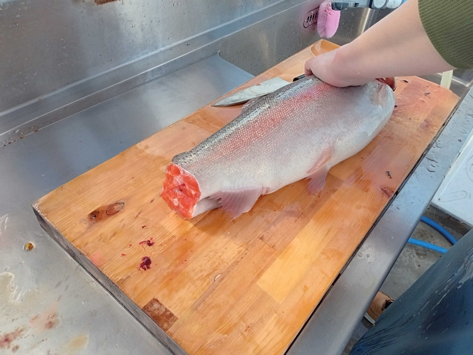 お客様からの注文の魚を一匹づつ、丁寧に心を込めて仕立てます。この日は三保サーモンを仕立てました。